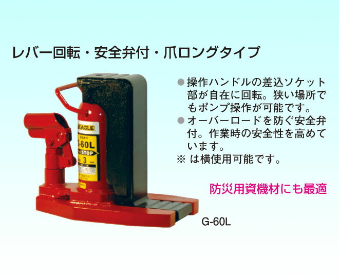 コード 品 番 爪荷重 爪長さ ストローク 1922-0407 G-25L 1.0ton 75mm 100mm 1922-0408 ※G-40L 2.0ton 80mm 110mm 1922-0409 ※G-60L 3.0ton 80mm 115mm 1922-0410 ※G-100L 5.0ton 75mm 130mm 1922-0411 G-160L 7.0ton 80mm 136mm 1922-0412 G-200L 10.0ton 80mm 140mm